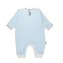Adorable knit romper in soft blue with matching blue trim details. Perfect for little ones who love comfort and style! This cozy one-piece keeps your baby looking sweet while staying snug and secure. The gentle knit fabric is ideal for playtime or special occasions. A charming wardrobe essential that parents adore.